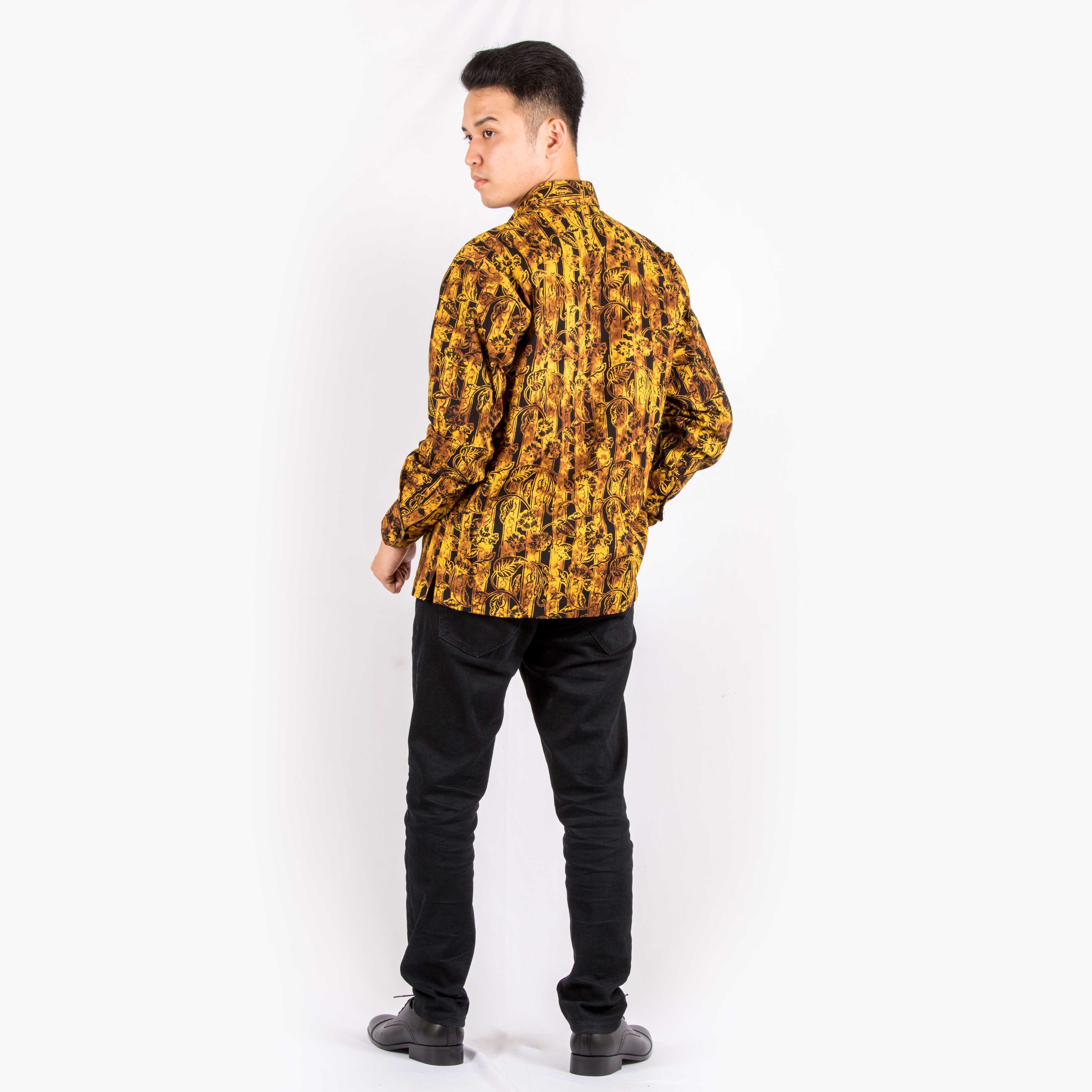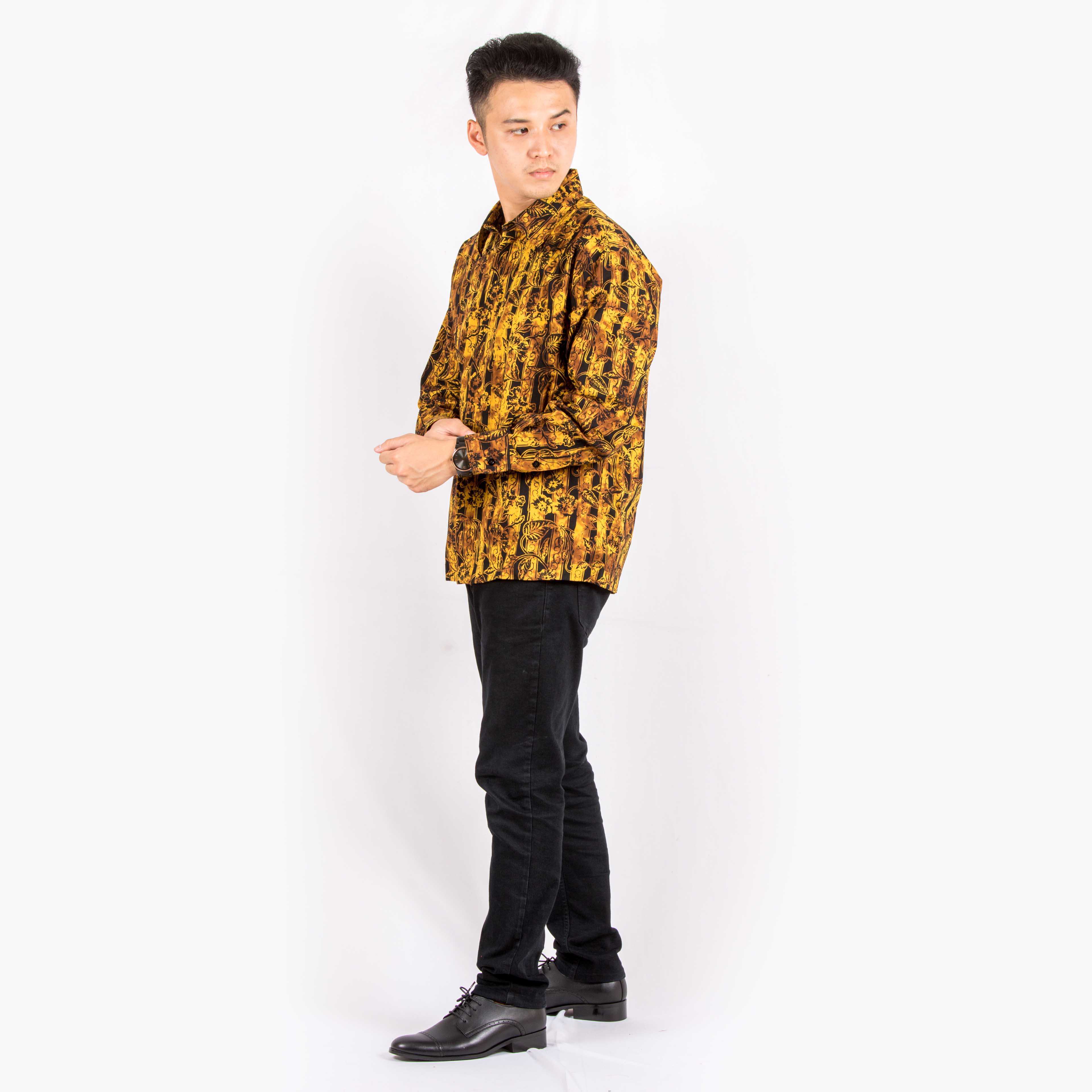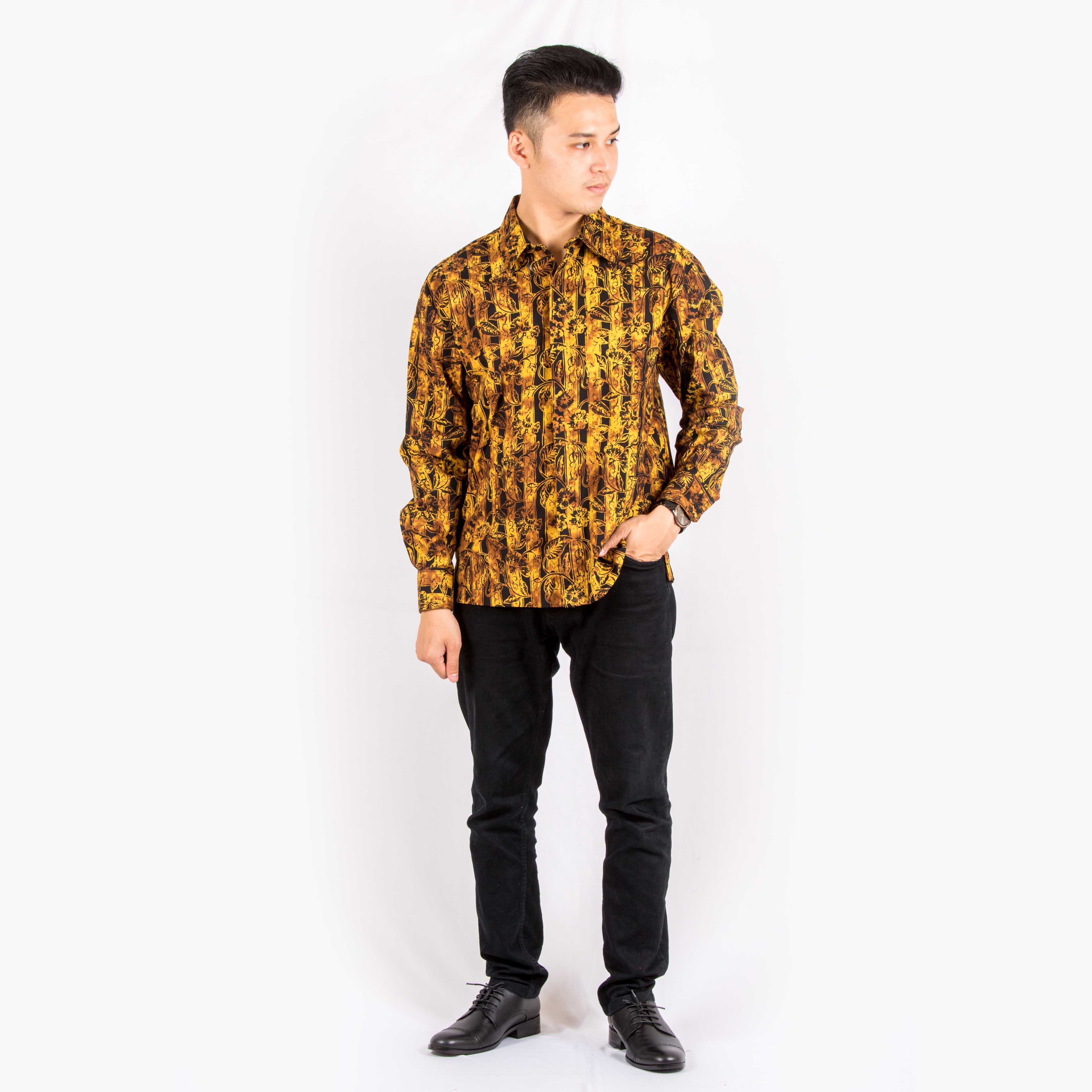 Model ini adalah standar kami untuk kemeja lengan panjang pria, yang tipikal dipilih untuk kemeja batik. Model ini memiliki fit yang longgar sehingga terasa lebih santai.